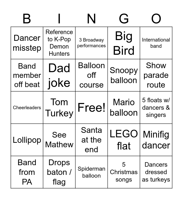 This bingo card has a free space and 24 words: See Mathew, Drops baton / flag, Balloon off course, Band from PA, International band, Dancer misstep, Band member off beat, Reference to K-Pop Demon Hunters, Mario balloon, Santa at the end, Snoopy balloon, Cheerleaders, LEGO flat, Minifig dancer, Dad joke, 5 Christmas songs, 5 floats w/ dancers & singers, 3 Broadway performances, Show parade route, Tom Turkey, Dancers dressed as turkeys, Lollipop, Big Bird and Spiderman balloon.