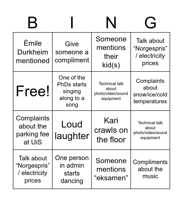 ⚠ This card has duplicate items: Cutlery drops on the floor (2), Someone mentions “eksamen” (2), Spontaneous “SKÅL” (2), One of the PhDs starts singing along to a song (2), Complaints about overeating (2), Borderline inappropriate joke (2), Talk about “Norgespris” / electricity prices (2), Hallmark Christmas movie reference (2), Someone spills a drink (2), Irish exit (2), Someone wears a Santa hat (2), Émile Durkheim mentioned (2), Someone mentions their kid(s) (2), “Underneath the Tree” played (2), Technical talk about photo/video/sound equipment (2), Complaints about snow/ice/cold temperatures (2), Complaints about the parking fee at UiS (2), Complaints about the music (2), Compliments about the music (2), One person in admin starts dancing (2), Complaints about DRIFTSENHETEN (2), Loud laughter (2), Someone spills food on the floor (2), Jenny dabs on the dancefloor (2), Kari crawls on the floor (2), One of the toilets runs out of toilet paper (2), Simone de Beauvoir mentioned (2), Cecilie starts rambling about Taylor Swift (2), Michel Foucault mentioned (2), Give someone a compliment (2), Pour someone you are sitting next to, a drink (2), Help clean up from the table after dinner (2), Take a selfie in the elevator (2), Compliments about the food/drinks (2)