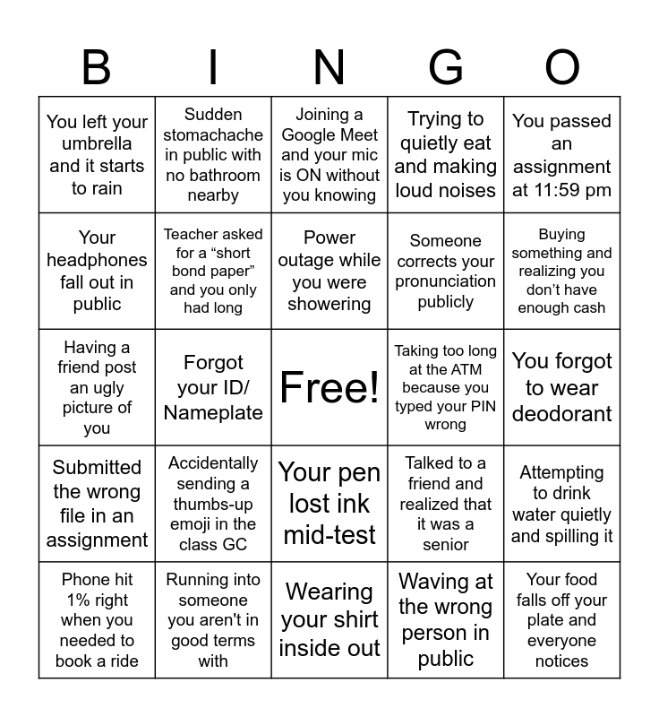 This bingo card has a free space and 33 words: Pulled an all-nighter, Studied the wrong topic for the quiz, Forgot your ID/ Nameplate, Failed a test this semester, Submitted the wrong file in an assignment, Teacher asked for a “short bond paper” and you only had long, You passed an assignment at 11:59 pm, Phone hit 1% right when you needed to book a ride, Sudden stomachache in public with no bathroom nearby, Accidentally liking a very old post while stalking someone, Power outage while you were showering, Joining a Google Meet and your mic is ON without you knowing, Your phone / alarm rang during class., Accidentally forwarding a message to a lot of people, Taking too long at the ATM because you typed your PIN wrong, Buying something and realizing you don’t have enough cash, Running into someone you aren't in good terms with, Having a friend post an ugly picture of you, Accidentally sending a thumbs-up emoji in the class GC, Talked to a friend and realized that it was a senior, Your pen lost ink mid-test, Forgetting to set your alarm and waking up late for class, You left your umbrella and it starts to rain, You forgot to wear deodorant, Wearing your shirt inside out, Your food falls off your plate and everyone notices, Trying to quietly eat and making loud noises, Someone corrects your pronunciation publicly, Your headphones fall out in public, Attempting to drink water quietly and spilling it, Accidentally stepping on someone’s foot, Waving at the wrong person in public and Forgetting to plug in your charger overnight.