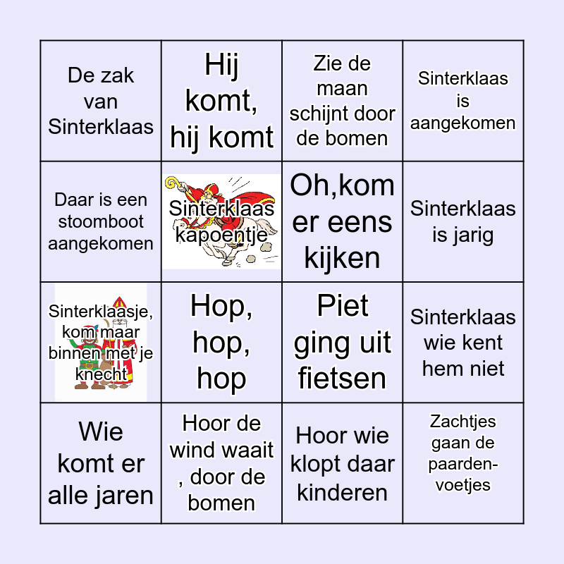 This bingo card has 4 images and 28 words: Zie ginds komt de stoomboot, Stooien, strooien, strooien, Sinterklaasje, kom maar binnen met je knecht, Sinterklaasje Bonne, bonne, Sinterklaas kapoentje, Zie de maan schijnt door de bomen, Hij komt, hij komt, Zachtjes gaan de paarden-voetjes, Hoor de wind waait , door de bomen, Rommel de bommel, Piet ging uit fietsen, Sinterklaas is aangekomen, Dag sinterklaasje, Daar wordt aan de deur geklopt, Hop, hop, hop, Sinterklaas, zegt moe, Jongens heb je het al vernomen, Oh,kom er eens kijken, Sinterklaas is jarig, Ik ben toch zeker Sinterklaas niet, De zak van Sinterklaas, Sinterklaas goedheiligman, Wie komt er alle jaren, Sinterklaas wie kent hem niet, Hoor wie klopt daar kinderen, Hij is voor groot en klein, Daar is een stoomboot aangekomen and Hé, zeg Piet, wiedewiedewiet.