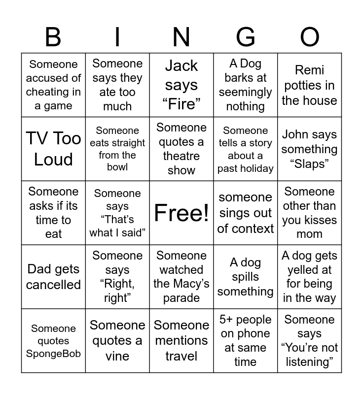 This bingo card has a free space and 24 words: Someone says “Right, right”, Someone quotes a vine, Someone quotes a theatre show, Someone quotes SpongeBob, Remi potties in the house, Someone accused of cheating in a game, TV Too Loud, Someone says they ate too much, someone sings out of context, Someone watched the Macy’s parade, Someone tells a story about a past holiday, Someone asks if its time to eat, A dog spills something, A dog gets yelled at for being in the way, Someone eats straight from the bowl, 5+ people on phone at same time, Someone other than you kisses mom, Jack says “Fire”, John says something “Slaps”, Someone says “That’s what I said”, Someone says “You’re not listening”, Dad gets cancelled, A Dog barks at seemingly nothing and Someone mentions travel.