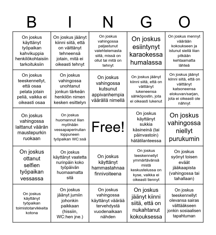 This bingo card has a free space and 24 words: On joskus käyttänyt vaatetta nurinpäin koko työpäivän huomaamatta sitä, On joskus jäänyt jumiin johonkin paikkaan (hissiin, WC:hen jne.), On joskus vahingossa kutsunut appivanhempia väärällä nimellä, On joskus käyttänyt työpaikan toimistotarvikkeita kotona, On joskus mennyt väärään kokoukseen ja istunut siellä liian pitkään kehtaamatta lähteä, On joskus käyttänyt työpaikan kahvikuppia henkilökohtaisiin tarkoituksiin, On joskus teeskennellyt, että osaa pelata jotain peliä, vaikka ei oikeasti osaa, On joskus jäänyt kiinni siitä, että on väittänyt tehneensä jotain, mitä ei oikeasti tehnyt, On joskus käyttänyt sukkia käsineinä (tai päinvastoin) hätätilanteessa, On joskus käyttänyt hammastahnaa finnivoiteena, On joskus jäänyt kiinni siitä, että on väittänyt lukeneensa sähköpostin, jota ei oikeasti lukenut, On joskus vahingossa laittanut väärän maustepurkin ruokaan, On joskus teeskennellyt ymmärtävänsä mistä keskustelussa on kyse, vaikka ei oikeasti tiennyt, On joskus syönyt toisen eväät jääkaapista (vahingossa tai tahallaan), On joskus vahingossa unohtanut jonkun tärkeän henkilön nimen kesken esittelyn, On joskus jäänyt kiinni siitä, että on nukahtanut kokouksessa, On joskus vahingossa niellyt purukumin, On joskus vahingossa paljastunut valehtelemasta siitä, missä on ollut tai mitä on tehnyt, On joskus jäänyt kiinni siitä, että on väittänyt katsoneensa elokuvan/sarjan, jota ei oikeasti ole nähnyt, On joskus huomannut liian myöhään vessapaperirullan loppuneen työpaikan WC:ssä, On joskus teeskennellyt olevansa sairas välttääkseen jonkin sosiaalisen tapahtuman, On joskus ottanut selfien työpaikan vessassa, On joskus esiintynyt karaokessa humalassa and On joskus vahingossa käyttänyt väärää tervehdystä vuodenaikaan nähden.