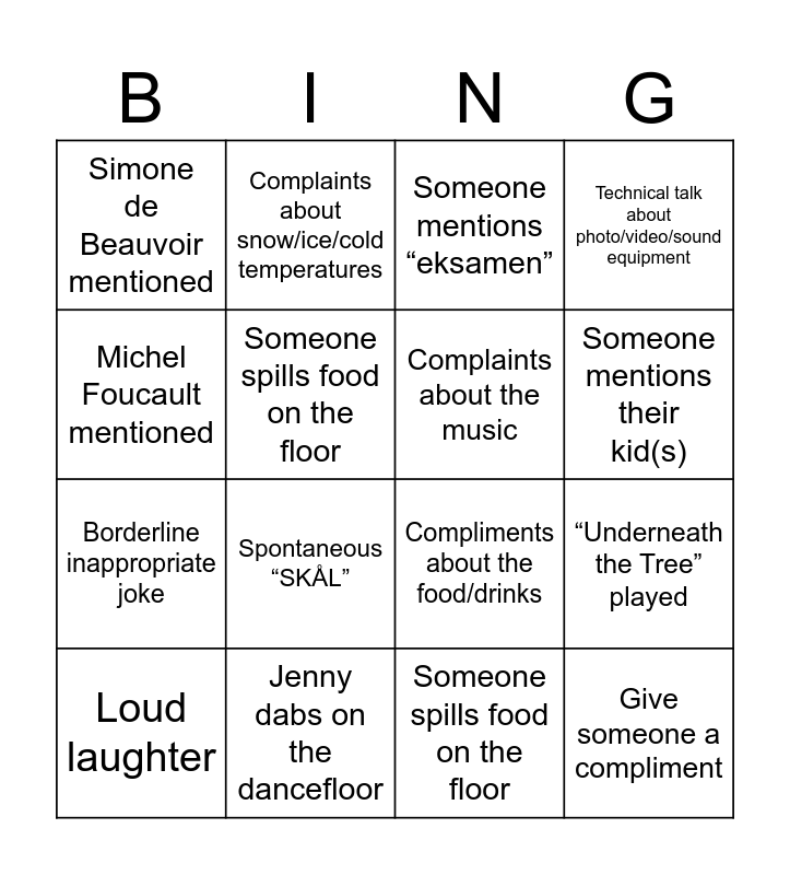 This bingo card has 41 words: Take a selfie in the elevator, Compliments about the food/drinks, Complaints about the parking fee at UiS, Complaints about the music, Someone wears a Santa hat, Émile Durkheim mentioned, Someone mentions their kid(s), Cecilie starts rambling about Taylor Swift, Michel Foucault mentioned, Give someone a compliment, “Underneath the Tree” played, Technical talk about photo/video/sound equipment, Loud laughter, Someone spills food on the floor, Jenny dabs on the dancefloor, Kari crawls on the floor, One of the toilets runs out of toilet paper, Simone de Beauvoir mentioned, Cutlery drops on the floor, Someone mentions “eksamen”, Compliments about the music, One person in admin starts dancing, Complaints about DRIFTSENHETEN, Borderline inappropriate joke, Talk about “Norgespris” / electricity prices, Hallmark Christmas movie reference, Someone spills a drink, Irish exit, Spontaneous “SKÅL”, One of the PhDs starts singing along to a song, Complaints about overeating, Complaints about snow/ice/cold temperatures, “Underneath the Tree” played, Technical talk about photo/video/sound equipment, Loud laughter, Someone spills food on the floor, Jenny dabs on the dancefloor, Kari crawls on the floor, One of the toilets runs out of toilet paper, Pour someone you are sitting next to, a drink and Help clean up from the table after dinner.