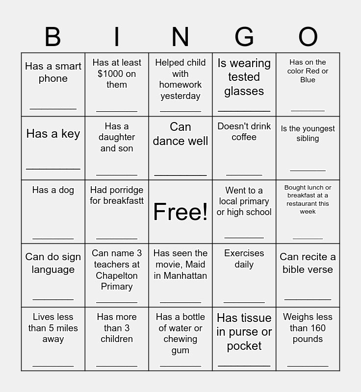 This bingo card has a free space and 24 words: Can name 3 teachers at Chapelton Primary ________, Has more than 3 children ________, Can dance well ________, Lives less than 5 miles away ________, Has on the color Red or Blue ________, Has a smart phone ________, Has a key ________, Has at least $1000 on them ________, Went to a local primary or high school ________, Has seen the movie, Maid in Manhattan ________, Doesn't drink coffee _______, Has a dog ________, Exercises daily ________, Can recite a bible verse ________, Has a daughter and son ________, Has tissue in purse or pocket ________, Bought lunch or breakfast at a restaurant this week ________, Helped child with homework yesterday ________, Is the youngest sibling ________, Had porridge for breakfastt ________, Weighs less than 160 pounds ________, Can do sign language _______, Is wearing tested glasses ________ and Has a bottle of water or chewing gum ________.