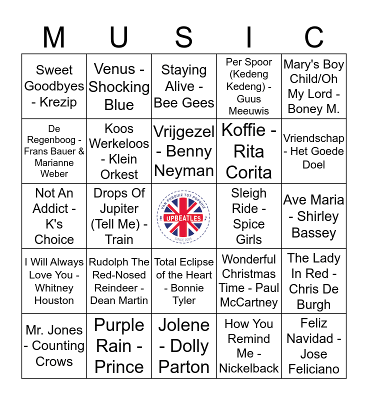 This bingo card has a free space and 24 words: Rudolph The Red-Nosed Reindeer - Dean Martin, Purple Rain - Prince, Vrijgezel - Benny Neyman, Mr. Jones - Counting Crows, Mary's Boy Child/Oh My Lord - Boney M., Sweet Goodbyes - Krezip, De Regenboog - Frans Bauer & Marianne Weber, Venus - Shocking Blue, Sleigh Ride - Spice Girls, Total Eclipse of the Heart - Bonnie Tyler, Koffie - Rita Corita, Not An Addict - K's Choice, Wonderful Christmas Time - Paul McCartney, The Lady In Red - Chris De Burgh, Koos Werkeloos - Klein Orkest, How You Remind Me - Nickelback, Ave Maria - Shirley Bassey, Staying Alive - Bee Gees, Vriendschap - Het Goede Doel, Drops Of Jupiter (Tell Me) - Train, Feliz Navidad - Jose Feliciano, I Will Always Love You - Whitney Houston, Per Spoor (Kedeng Kedeng) - Guus Meeuwis and Jolene - Dolly Parton.