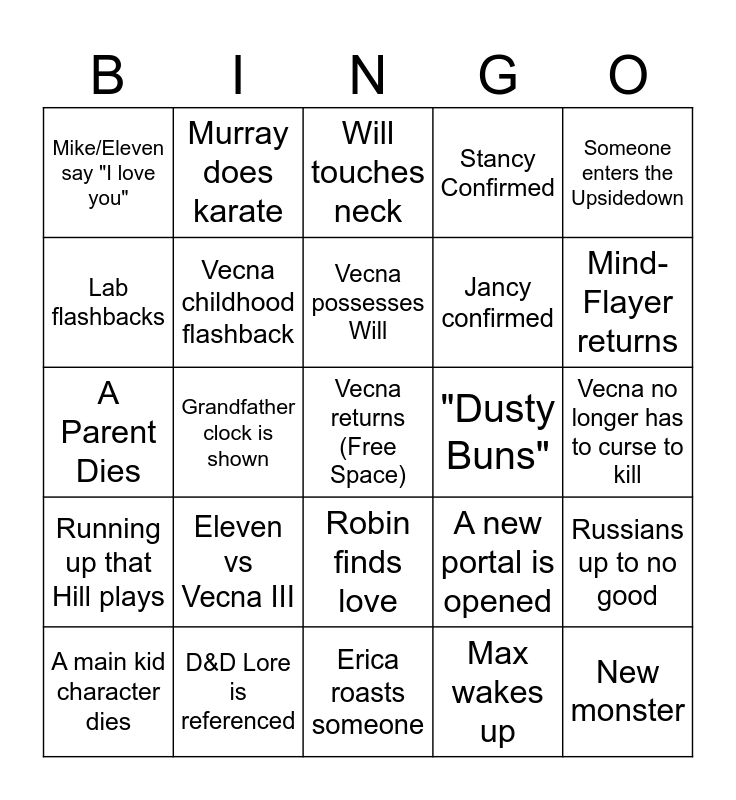 This bingo card has a free space and 24 words: Eleven vs Vecna III, D&D Lore is referenced, Vecna possesses Will, A main kid character dies, Someone enters the Upsidedown, Mike/Eleven say "I love you", Lab flashbacks, Murray does karate, "Dusty Buns", Robin finds love, Jancy confirmed, A Parent Dies, A new portal is opened, Russians up to no good, Vecna childhood flashback, Max wakes up, Vecna no longer has to curse to kill, Will touches neck, Mind-Flayer returns, Grandfather clock is shown, New monster, Running up that Hill plays, Stancy Confirmed and Erica roasts someone.
