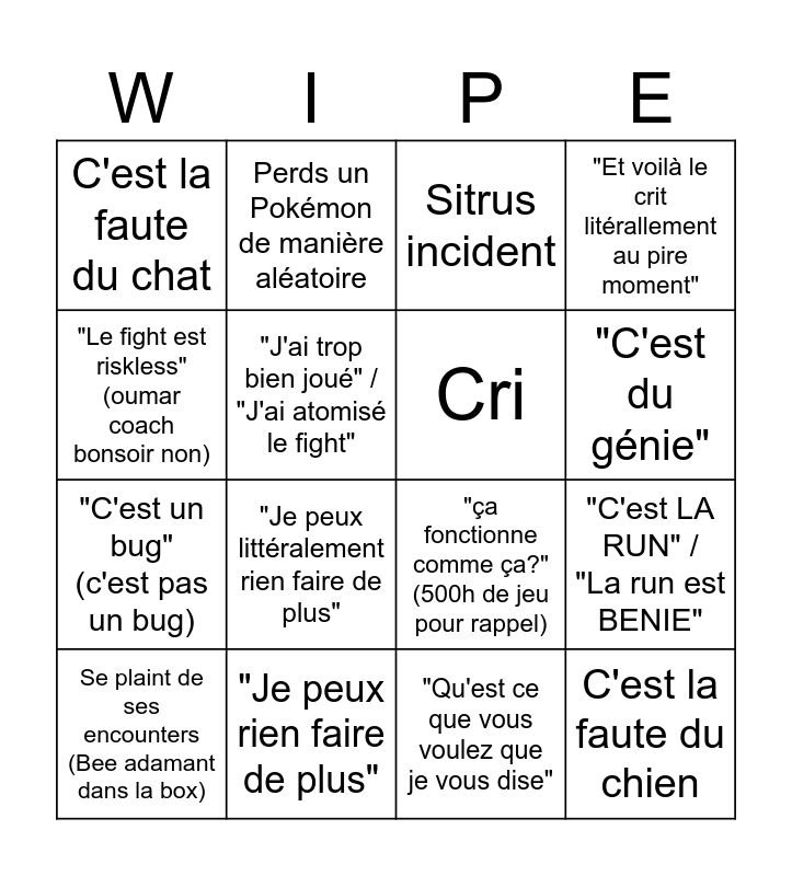This bingo card has 16 words: "Je peux rien faire de plus", "C'est LA RUN" / "La run est BENIE", Sitrus incident, C'est la faute du chat, "C'est un bug" (c'est pas un bug), Perds un Pokémon de manière aléatoire, "ça fonctionne comme ça?" (500h de jeu pour rappel), "Qu'est ce que vous voulez que je vous dise", "Le fight est riskless" (oumar coach bonsoir non), "J'ai trop bien joué" / "J'ai atomisé le fight", Se plaint de ses encounters (Bee adamant dans la box), "Et voilà le crit litérallement au pire moment", "Je peux littéralement rien faire de plus", "C'est du génie", Cri and C'est la faute du chien.
