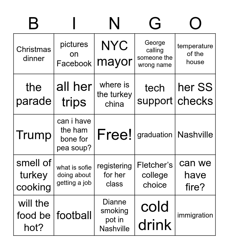 This bingo card has a free space and 24 words: will the food be hot?, what is sofie doing about getting a job, where is the turkey china, cold drink, temperature of the house, Christmas dinner, pictures on Facebook, NYC mayor, graduation, Nashville, Trump, all her trips, Fletcher’s college choice, can we have fire?, the parade, football, Dianne smoking pot in Nashville, George calling someone the wrong name, her SS checks, smell of turkey cooking, can i have the ham bone for pea soup?, registering for her class, tech support and immigration.