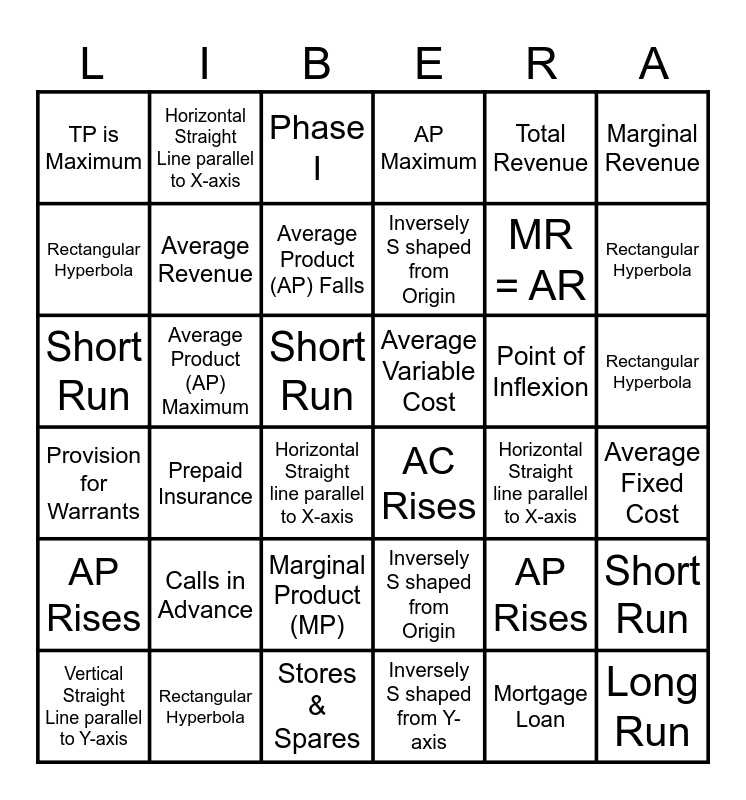 This bingo card has 139 words: Forfeited Shares A/c, Calls in Arrears, Debenture Redemption Reserve, Public Deposit, Mortgage Loan, Provision for Warrants, Provision for Retirement Benefits, Bank Overdraft, Loan payable on demand, Provision for Tax, Employees Earned Leave Encashable, Livestock, Shares in Listed Companies, Advance to Subsidaries, Security Deposit, Stock in Trade, Stores & Spares, Cheque in hand, Mining Rights, Marketable Securities, Accrued Income, Prepaid Insurance, Calls in Advance, Copyrights, Premium on Redemprion of Debentures, Rectangular Hyperbola, Horizontal Straight Line parallel to X-axis, Vertical Straight Line parallel to Y-axis, Flatter Curve, Steeper Curve, Marginal Product (MP), Point of Inflexion, TP is Maximum, Short Run, Long Run, Phase I, Phase II, Phase III, AP Rises, AP Maximum, AP Falls, Opportunity Cost, Inversely S shaped from Origin, Inversely S shaped from Y-axis, Horizontal Straight line parallel to X-axis, U Shaped, Average Variable Cost, Marginal Cost, Rectangular Hyperbola, MC = MR, MC > MR, MR = AR, Average Revenue, AC Rises, AC Minimum, AC Falls, Total Revenue, Marginal Revenue, Horizontal Straight line parallel to X-axis, Total Fixed Cost, Average Fixed Cost, Profit, TR is Maximum, Rectangular Hyperbola, Horizontal Straight Line parallel to X-axis, Vertical Straight Line parallel to Y-axis, Flatter Curve, Steeper Curve, Marginal Product (MP), Point of Inflexion, TP is Maximum, Short Run, Long Run, Phase I, Phase II, Phase III, AP Rises, AP Maximum, AP Falls, Opportunity Cost, Inversely S shaped from Origin, Inversely S shaped from Y-axis, Horizontal Straight line parallel to X-axis, U Shaped, Average Variable Cost, Marginal Cost, Rectangular Hyperbola, MC = MR, MC > MR, MR = AR, Average Revenue, AC Rises, AC Minimum, AC Falls, Total Revenue, Marginal Revenue, Horizontal Straight line parallel to X-axis, Total Fixed Cost, Average Fixed Cost, Profit, TR is Maximum, Rectangular Hyperbola, Horizontal Straight Line parallel to X-axis, Vertical Straight Line parallel to Y-axis, Flatter Curve, Steeper Curve, Marginal Product (MP), Point of Inflexion, Total Product (TP) is Maximum, Short Run, Long Run, Phase I, Phase II, Phase III, Average Product (AP) Rises, Average Product (AP) Maximum, Average Product (AP) Falls, Opportunity Cost, Inversely S shaped from Origin, Inversely S shaped from Y-axis, Horizontal Straight line parallel to X-axis, U Shaped, Average Variable Cost, Marginal Cost, Rectangular Hyperbola, Marginal Cost = Marginal Revenue, Marginal Cost > Marginal Revenue, Marginal Revenue = Average Revenue, Average Revenue, Average Cost Rises, Average Cost Minimum, Average Cost Falls, Total Revenue, Marginal Revenue, Horizontal Straight line parallel to X-axis, Total Fixed Cost, Average Fixed Cost, Profit and Total Revenue is Maximum.