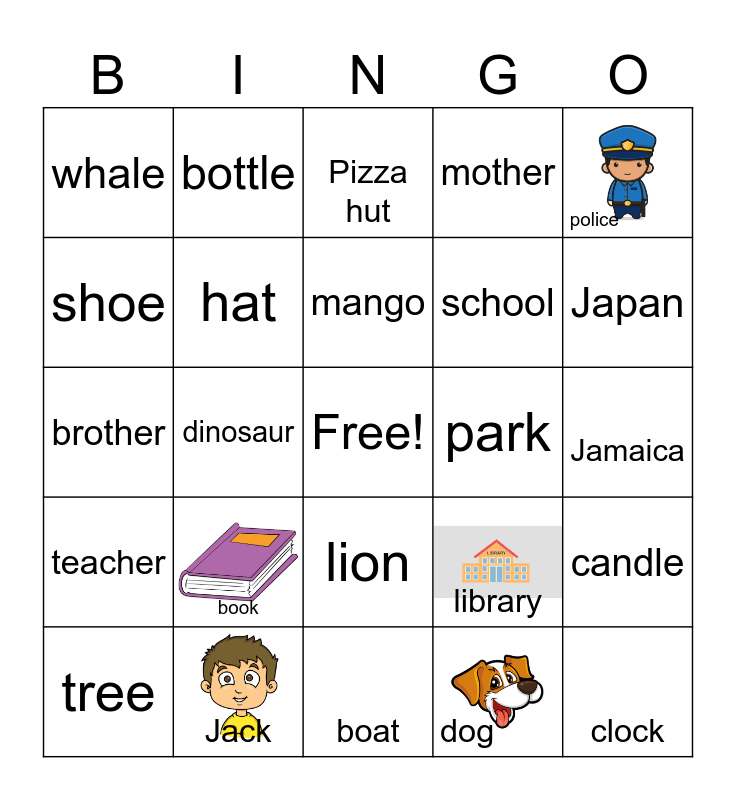 This bingo card has 5 images, a free space and 24 words: book, Jack, mango, tree, police, whale, shoe, bottle, park, lion, school, brother, library, candle, hat, dog, Jamaica, Pizza hut, Japan, dinosaur, clock, teacher, mother and boat.