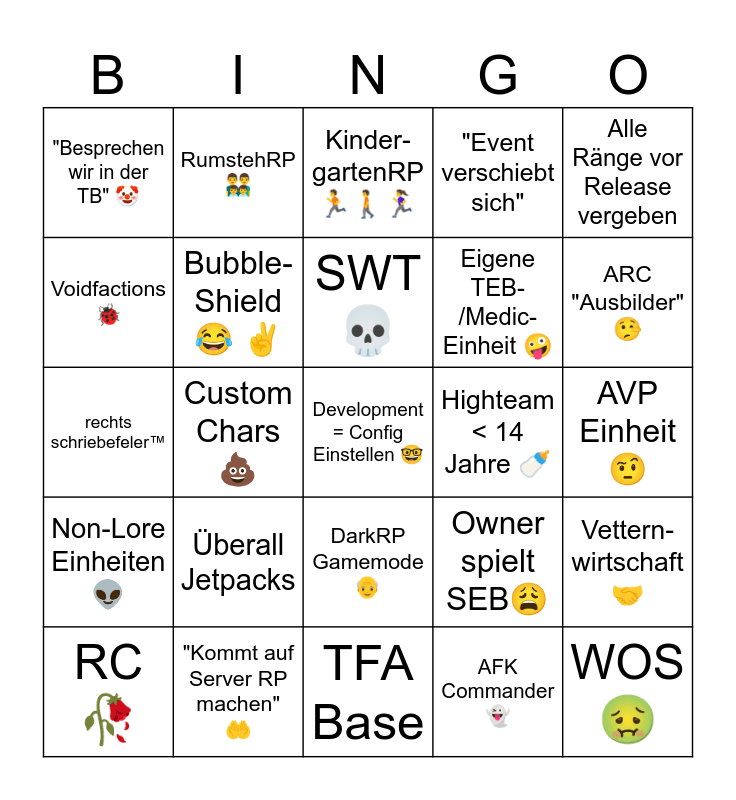 This bingo card has 25 words: Überall Jetpacks, TFA Base, SWT 💀, RC 🥀, Alle Ränge vor Release vergeben, "Besprechen wir in der TB" 🤡, Voidfactions 🐞, RumstehRP 👨👨👦👦, Highteam < 14 Jahre 🍼, DarkRP Gamemode 👴, Eigene TEB- /Medic-Einheit 🤪, rechts schriebefeler™, Owner spielt SEB😩, Vettern-wirtschaft 🤝, Bubble-Shield 😂 ✌️, WOS 🤢, AVP Einheit 🤨, Kinder-gartenRP 🏃🚶🏃♀️, ARC "Ausbilder" 🤥, Custom Chars 💩, Development = Config Einstellen 🤓, "Kommt auf Server RP machen" 🤲, Non-Lore Einheiten 👽, "Event verschiebt sich" and AFK Commander👻.