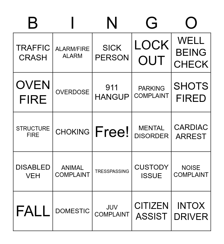 This bingo card has a free space and 24 words: FALL, ANIMAL COMPLAINT, 911 HANGUP, CITIZEN ASSIST, WELL BEING CHECK, TRAFFIC CRASH, ALARM/FIRE ALARM, SICK PERSON, MENTAL DISORDER, CARDIAC ARREST, STRUCTURE FIRE, OVERDOSE, CUSTODY ISSUE, NOISE COMPLAINT, OVEN FIRE, DOMESTIC, JUV COMPLAINT, LOCK OUT, SHOTS FIRED, DISABLED VEH, CHOKING, TRESSPASSING, PARKING COMPLAINT and INTOX DRIVER.