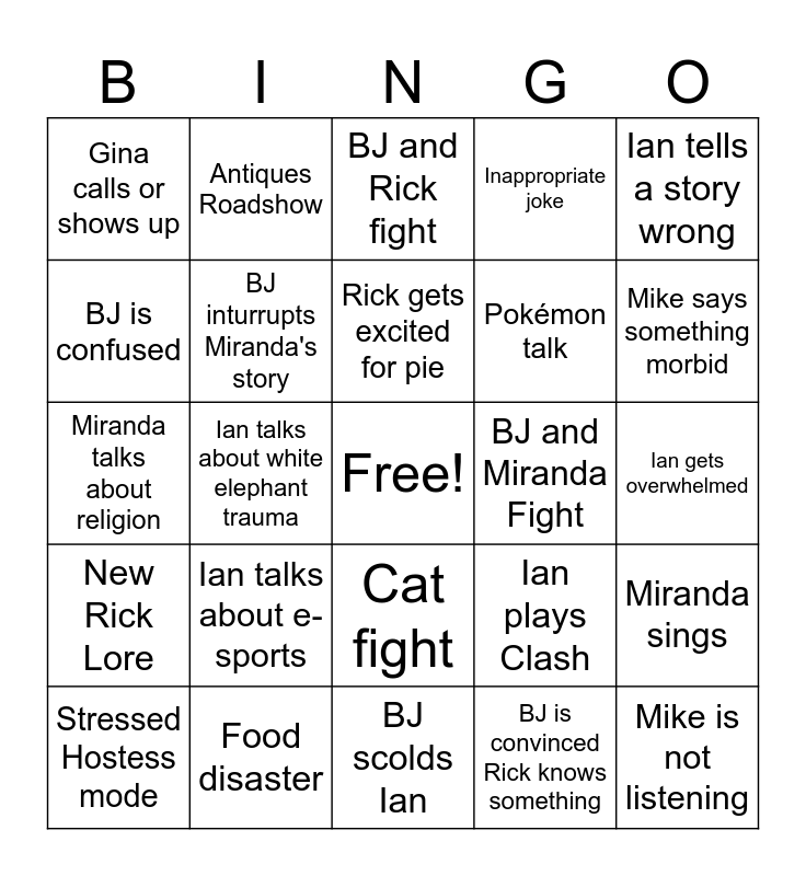 This bingo card has a free space and 24 words: Ian talks about e-sports, Food disaster, Rick gets excited for pie, Stressed Hostess mode, Ian tells a story wrong, Gina calls or shows up, BJ is confused, Antiques Roadshow, BJ and Miranda Fight, Cat fight, Pokémon talk, Miranda talks about religion, Ian plays Clash, Miranda sings, BJ inturrupts Miranda's story, BJ is convinced Rick knows something, Ian gets overwhelmed, BJ and Rick fight, Mike says something morbid, Ian talks about white elephant trauma, Mike is not listening, New Rick Lore, Inappropriate joke and BJ scolds Ian.