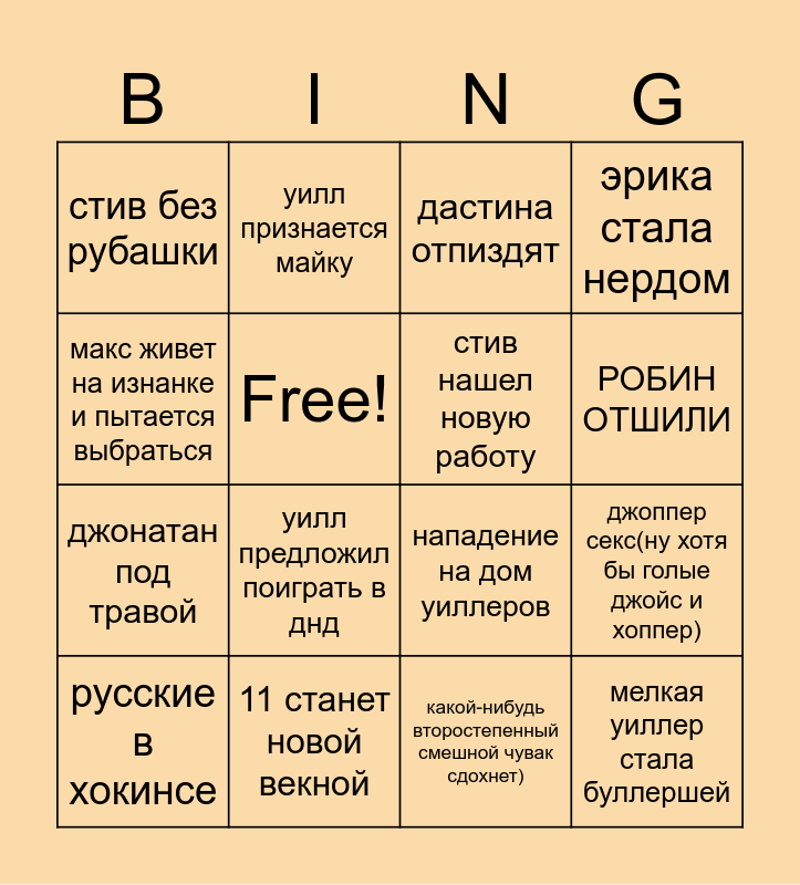 This bingo card has 16 words: 11 станет новой векной, джоппер секс(ну хотя бы голые джойс и хоппер), дастина отпиздят, стив без рубашки, джонатан под травой, уилл признается майку, нападение на дом уиллеров, какой-нибудь второстепенный смешной чувак сдохнет), макс живет на изнанке и пытается выбраться, Free!, русские в хокинсе, эрика стала нердом, уилл предложил поиграть в днд, РОБИН ОТШИЛИ, стив нашел новую работу and мелкая уиллер стала буллершей.