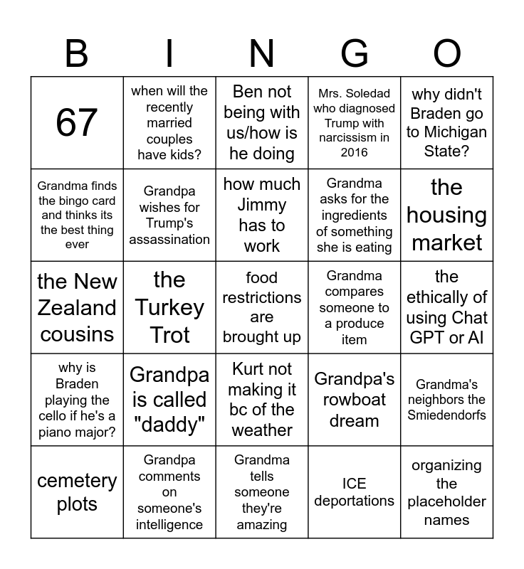 This bingo card has a free space and 24 words: cemetery plots, Grandpa is called "daddy", how much Jimmy has to work, ICE deportations, why didn't Braden go to Michigan State?, 67, when will the recently married couples have kids?, Ben not being with us/how is he doing, Grandma compares someone to a produce item, the ethically of using Chat GPT or AI, the New Zealand cousins, Grandpa wishes for Trump's assassination, Grandpa's rowboat dream, Grandma's neighbors the Smiedendorfs, Grandma finds the bingo card and thinks its the best thing ever, Grandpa comments on someone's intelligence, Grandma tells someone they're amazing, Mrs. Soledad who diagnosed Trump with narcissism in 2016, the housing market, why is Braden playing the cello if he's a piano major?, the Turkey Trot, Kurt not making it bc of the weather, Grandma asks for the ingredients of something she is eating and organizing the placeholder names.