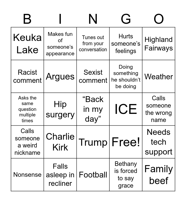 This bingo card has 25 words: Charlie Kirk, Football, Sexist comment, Nonsense, Highland Fairways, Keuka Lake, Racist comment, Makes fun of someone’s appearance, ICE, Trump, Doing something he shouldn’t be doing, Asks the same question multiple times, Free!, Needs tech support, Argues, Family beef, Calls someone the wrong name, Tunes out from your conversation, Weather, Hip surgery, “Back in my day”, Falls asleep in recliner, Calls someone a weird nickname, Hurts someone’s feelings and Bethany is forced to say grace.