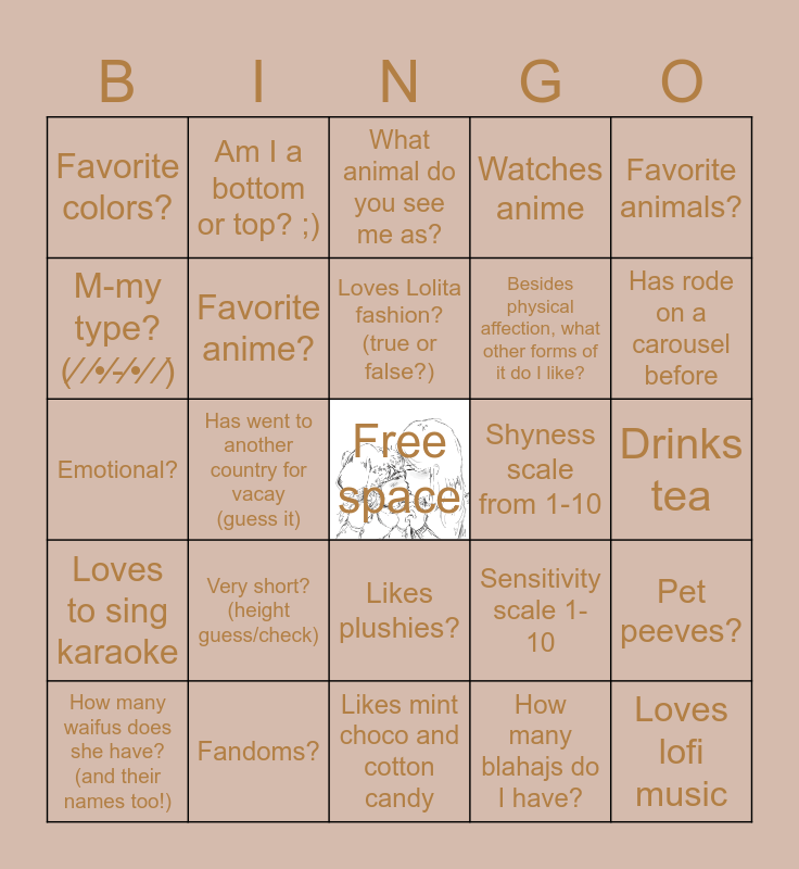 This bingo card has a free space and 24 words: Very short? (height guess/check), Fandoms?, Loves Lolita fashion? (true or false?), How many waifus does she have? (and their names too!), Favorite animals?, Favorite colors?, M-my type? (⁄ ⁄•⁄-⁄•⁄ ⁄), Am I a bottom or top? ;), Shyness scale from 1-10, Likes plushies?, Besides physical affection, what other forms of it do I like?, Emotional?, Sensitivity scale 1-10, Pet peeves?, Favorite anime?, How many blahajs do I have?, Drinks tea, What animal do you see me as?, Has rode on a carousel before, Has went to another country for vacay (guess it), Loves lofi music, Loves to sing karaoke, Watches anime and Likes mint choco and cotton candy.