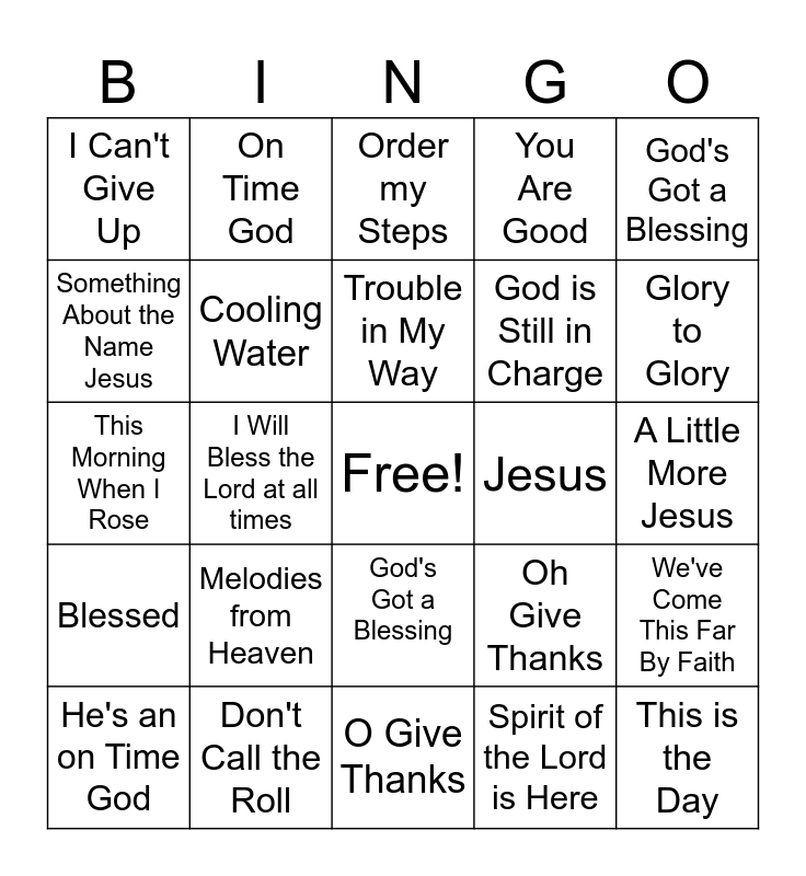 This bingo card has a free space and 24 words: Melodies from Heaven, Don't Call the Roll, Trouble in My Way, He's an on Time God, God's Got a Blessing, I Can't Give Up, Something About the Name Jesus, On Time God, Jesus, God's Got a Blessing, God is Still in Charge, This Morning When I Rose, Oh Give Thanks, We've Come This Far By Faith, Cooling Water, Spirit of the Lord is Here, A Little More Jesus, Order my Steps, Glory to Glory, I Will Bless the Lord at all times, This is the Day, Blessed, You Are Good and O Give Thanks.