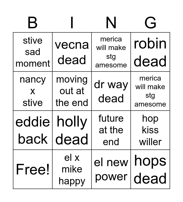 This bingo card has 23 words: hops dead, time travel, merica will make stg amesome, future at the end, nancy x stive, stive sad moment, moving out at the end, vecna dead, Free!, harington bf x stive, holly dead, eddie back, robin dead, max x lucas happy, el x mike happy, hop kiss willer, merica will make stg amesome, future at the end, dr way dead, hop kiss willer, robin dead, el new power and stive sad moment.