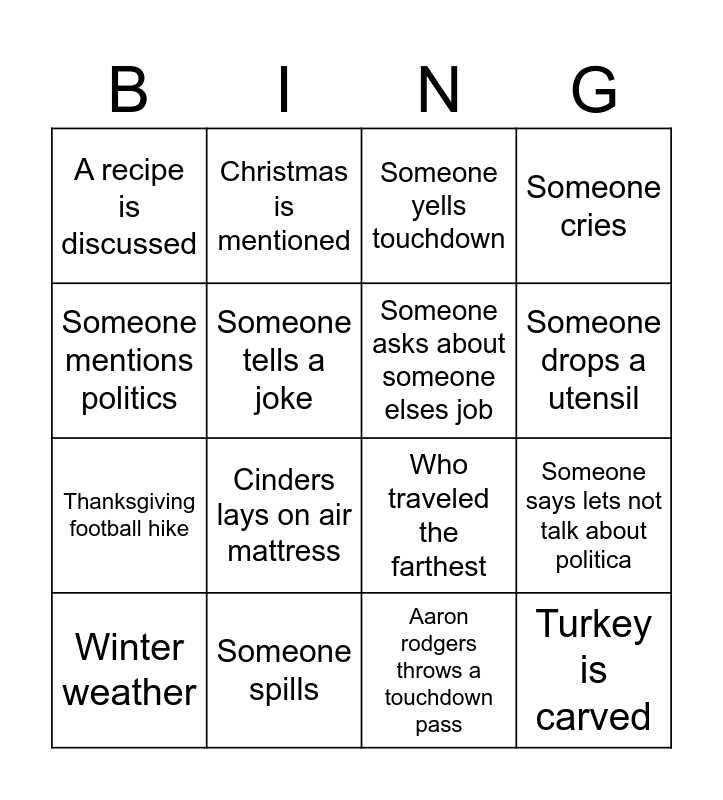 This bingo card has 16 words: Someone spills, Someone says lets not talk about politica, Someone yells touchdown, A recipe is discussed, Thanksgiving football hike, Christmas is mentioned, Who traveled the farthest, Aaron rodgers throws a touchdown pass, Someone mentions politics, Someone tells a joke, Winter weather, Someone cries, Cinders lays on air mattress, Someone drops a utensil, Someone asks about someone elses job and Turkey is carved.
