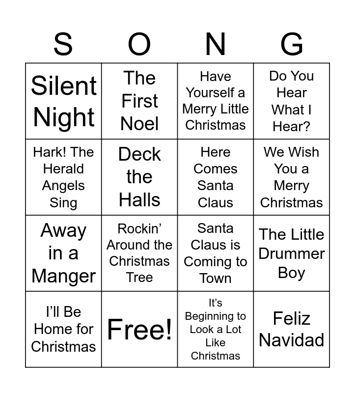 This bingo card has 24 words: Jingle Bells, Joy to the World, We Wish You a Merry Christmas, O Come All Ye Faithful, Hark! The Herald Angels Sing, Silent Night, Deck the Halls, The First Noel, Free!, Rudolph the Red-Nosed Reindeer, Away in a Manger, Santa Claus is Coming to Town, Frosty the Snowman, O Holy Night, Here Comes Santa Claus, White Christmas, It’s Beginning to Look a Lot Like Christmas, Have Yourself a Merry Little Christmas, Rockin’ Around the Christmas Tree, The Little Drummer Boy, I’ll Be Home for Christmas, Feliz Navidad, Do You Hear What I Hear? and Let It Snow.