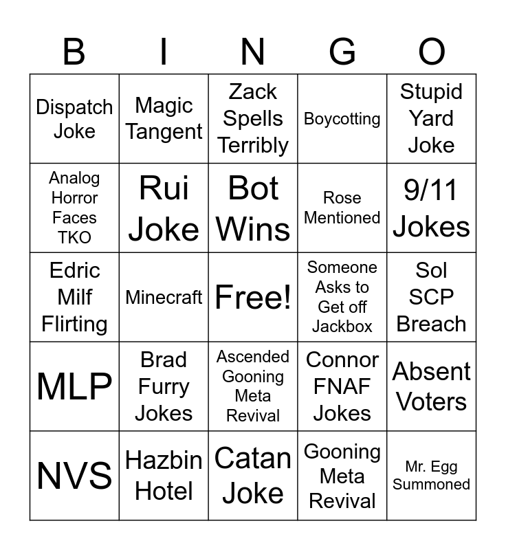 This bingo card has a free space and 24 words: Brad Furry Jokes, Hazbin Hotel, Bot Wins, NVS, Stupid Yard Joke, Dispatch Joke, Analog Horror Faces TKO, Magic Tangent, Someone Asks to Get off Jackbox, Ascended Gooning Meta Revival, Rose Mentioned, Edric Milf Flirting, Connor FNAF Jokes, Absent Voters, Rui Joke, Gooning Meta Revival, Sol SCP Breach, Zack Spells Terribly, 9/11 Jokes, Minecraft, Mr. Egg Summoned, MLP, Boycotting and Catan Joke.