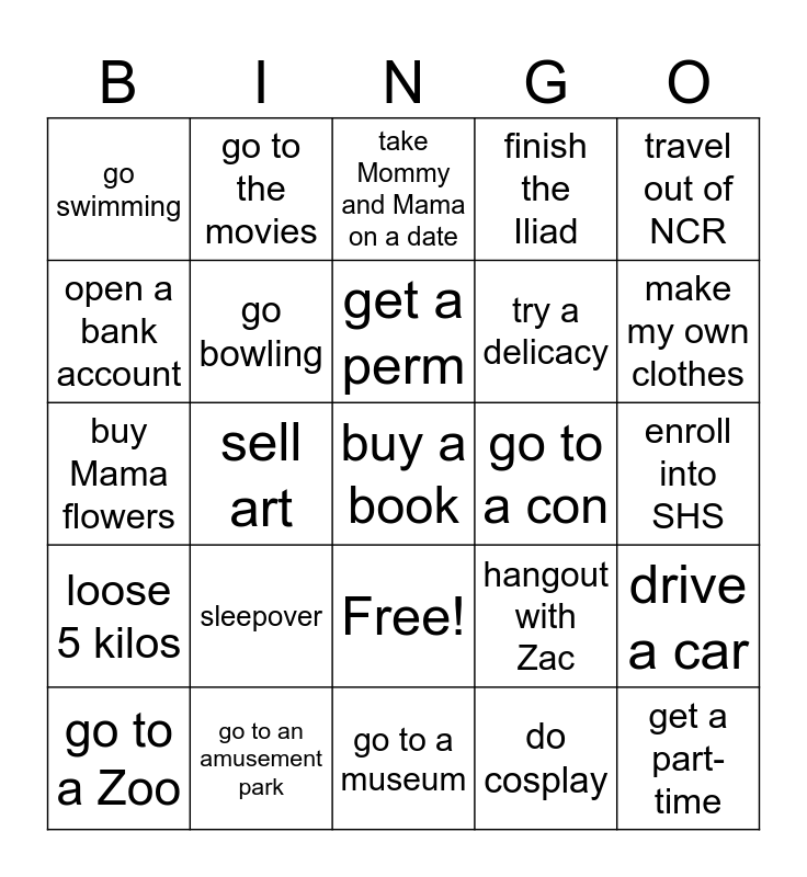 This bingo card has 26 words: Free!, do cosplay, get a perm, go to an amusement park, travel out of NCR, go swimming, open a bank account, go to the movies, enroll into SHS, hangout with Zac, try a delicacy, buy Mama flowers, drive a car, go to a Zoo, sell art, go to a party, finish the Iliad, loose 5 kilos, take Mommy and Mama on a date, buy a book, make my own clothes, go to a museum, go to a con, sleepover, go bowling and get a part-time.