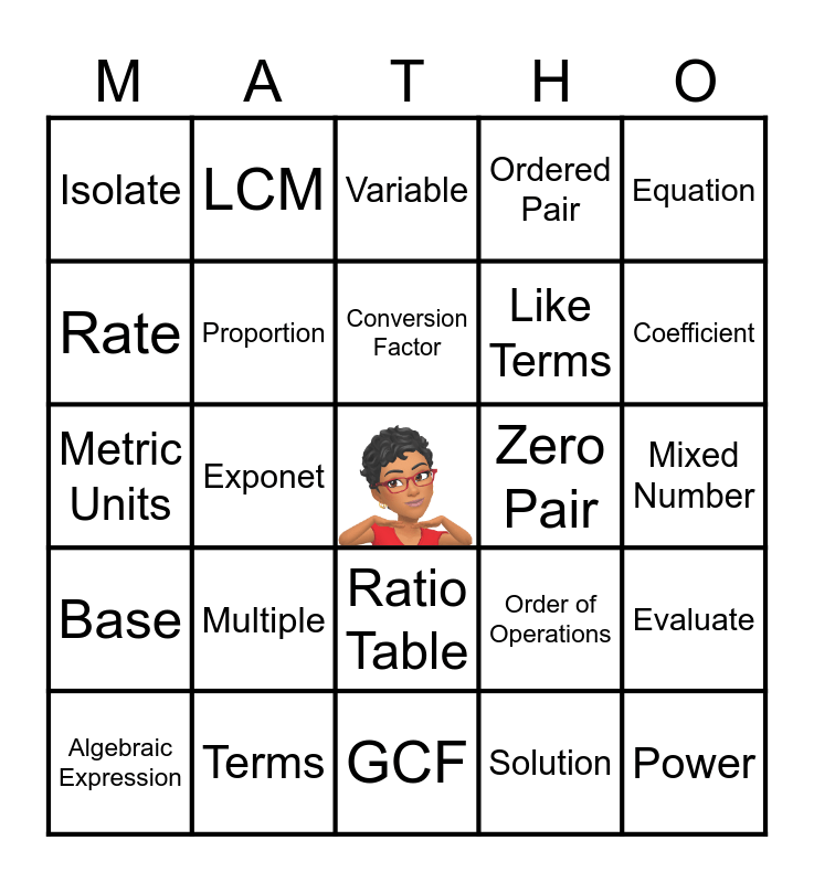 This bingo card has a free space and 35 words: Ratio, Equivalent Ratio, WKU, Proportion, Ratio Table, Ordered Pair, Rate, Unit Rate, Conversion Factor, Customary Units, Metric Units, Equation, Expression, Inverse Operations, Isolate, Zero Pair, Solution, Exponet, Base, Power, Order of Operations, Algebraic Expression, Evaluate, Terms, Variable, Coefficient, Constant, Factor, Like Terms, Mixed Number, Improper Fraction, GCF, Multiple, LCM and Word Ratio.