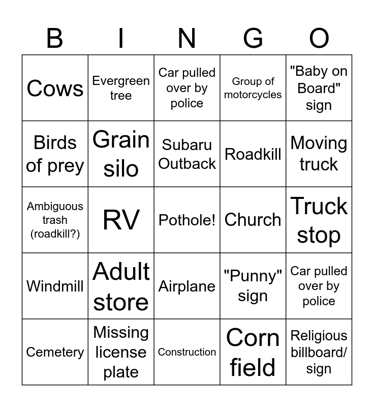 This bingo card has a free space and 29 words: Cemetery, Tractor/ farm equipment on road, RV, Train, Cows, Car pulled over by police, Grain silo, Adult store, Church, Missing license plate, Truck stop, Religious billboard/ sign, Construction, Corn field, Moving truck, Evergreen tree, Airplane, Windmill, "Baby on Board" sign, Ambiguous trash (roadkill?), "Punny" sign, Horse trailer with horses, Roadkill, Birds of prey, Group of motorcycles, Evergreen tree, Car pulled over by police, Subaru Outback and State line.
