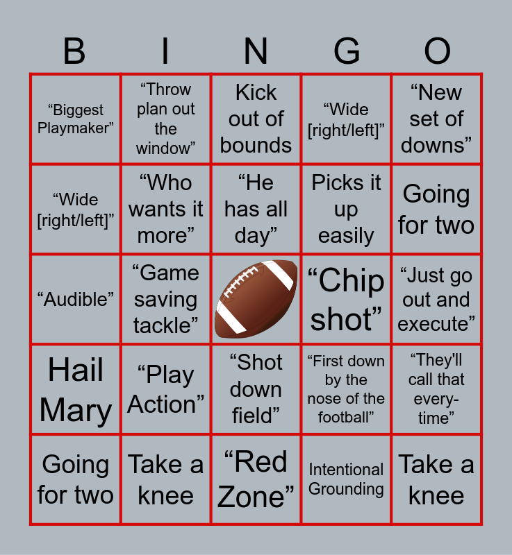 ⚠ This card has duplicate items: “They'll call that every-time” (2), “Could go all the way” (2), “One score game” (2), Pick 6 (2), Interception (2), Roughing the passer (2), Encroachment (2), Neutral zone infraction (2), Safety (2), Fake Punt (2), Going for two (2), 12 men on the field (2), “Wide [right/left]” (2), “Red Zone” (2), Kick out of bounds (2), Fumble (2), Face Mask (2), On Side Kick (2), “Two minute warning” (2), Hail Mary (3), “Ice the kicker” (2), Draw offsides attempt (2), DOINK! (2), Delay of Game (3), “Showing Blitz” (2), Sacked (3), “Keeps the drive alive” (3), “New set of downs” (2), “That will move the chains” (3), “Penetration” (2), “Settle for 3” (2), Intentional Grounding (2), Pylon Cam (2), “Slow getting up” (2), “Extent of his injuries” (2), Take a knee (2), Helmet to helmet (2)