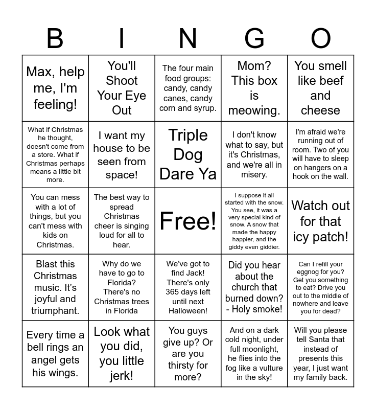 This bingo card has a free space and 85 words: I think we're gettin' scammed by a Kindergartener, His heart was 2 sizes too small, The four main food groups: candy, candy canes, candy corn and syrup., Nobody's walking out on this fun, old fashioned family Christmas., KEVIN?!!, You'll shoot your eye out kid!, God Bless us every one!, Merry Christmas you filthy animal., Isn't there anyone who knows what Christmas is all about?, Just remember the true spirit of Christmas lies in your heart., Dasher, Dancer, Prancer, Bambi, Dave, you with the white ear, you... and you!, Seeing isn't believing. Believing is seeing., I want my house to be seen from space!, I suppose it all started with the snow. You see, it was a very special kind of snow. A snow that made the happy happier, and the giddy even giddier., Now I have a machine gun. Ho Ho Ho, Max, help me, I'm feeling!, Every time a bell rings an angel gets his wings., What if Christmas he thought, doesn't come from a store. What if Christmas perhaps means a little bit more., You're skipping Christmas! Isn't that against the law?, This is my house. I have to defend it., I pictured Santa turning himself into sort of this big blob and oozing through the heating vents, I don't know what to say, but it's Christmas, and we're all in misery., Will you please tell Santa that instead of presents this year, I just want my family back., There's a certain magic that comes from the first snow, The best way to spread Christmas cheer is singing loud for all to hear., "Are we on a coffee break?" "We don't drink coffee." "Then I guess the break is over!", All the great ones leave their mark. We’re the wet bandits!, Just a fly in the ointment, Hans. The monkey in the wrench., Yippee-ki-yay., Seeing is believing, but sometimes the most real things in the world are the things we can’t see., Why do we have to go to Florida? There's no Christmas trees in Florida, Harry? You wearin' aftershave?, There's Nobody Dumb Enough To Knock Off A Toy Store On Christmas Eve., You can mess with a lot of things, but you can't mess with kids on Christmas., You’re what the French call, ‘les incompétents', I will honor Christmas in my heart and try to keep it all the year., You guys give up? Or are you thirsty for more?, Guys, I’m eating junk and watching rubbish! You better come out and stop me, Blast this Christmas music. It’s joyful and triumphant., I'm afraid we're running out of room. Two of you will have to sleep on hangers on a hook on the wall., Merry Christmas, little fella. We know that you’re in there, and that you’re all alone., It's cold enough to freeze your Winnebago!, Every time a bell rings, an angel gets his wings., I never thought it was such a bad little tree. It’s not bad at all, really. Maybe it just needs a little love., Isn't it wonderful? I'm going to jail!, The bell still rings for all who truly believe., Put the cookie down! NOW!, God bless us, every one., That's twice this month you've slipped deadly nightshade into my tea and run off., Oh, Fudge, You'll Shoot Your Eye Out, Triple Dog Dare Ya, Fraa-jeel-aay! It must be Italian!, Buzz, your girlfriend. WOOF!, Keep the change, ya filthy animal., Santa!!!!! Santa, here?! I know him! I know him!!, Look what you did, you little jerk!, Mom? This box is meowing., Son of a nutcracker!, And why is the carpet all wet, Todddddd?, The Yule Ball is of course a chance for us all to — er — let our hair down., Why, To the North Pole, of course! This Is the Polar Express, 4:00, wallow in self-pity, Where are you gonna get more sweaters after the circus pulls out of town?, You want me to take the toys down the chimney into a strange house, IN MY UNDERWEAR?, You smell like beef and cheese, What if Christmas, he thought, doesn't come from a store, Can I refill your eggnog for you? Get you something to eat? Drive you out to the middle of nowhere and leave you for dead?, When I wake up, I'm getting a CAT scan!, He looks like a deranged Easter Bunny., We're your worst nightmare. Elves with attitude., "What'd it feel like, Dad?" "It felt like America's Most Wanted., Well, isn't that a pretty picture, Santa rolling down the block in a PANZER!, Save the neck for me, Clark!, I don’t want to spend the holidays dead!, We've got to find Jack! There's only 365 days left until next Halloween!, And on a dark cold night, under full moonlight, he flies into the fog like a vulture in the sky!, Say it once, say it twice, take a chance and roll the dice. Ride with the moon in the dead of night., Nothing says Christmas like cold hard cash, If it seems too complicated, make it easy on yourself: just send money. How about tens and twenties, Watch out for that icy patch!, Aw, that was fun! Even weirdos are cute when they're babies., You think you're disappointed? I just took three months of surfing lessons for zip., Did you hear about the church that burned down? - Holy smoke! and "PIGGY PUDDING?" "No, no, no. Figgy pudding. It's made with figs.".