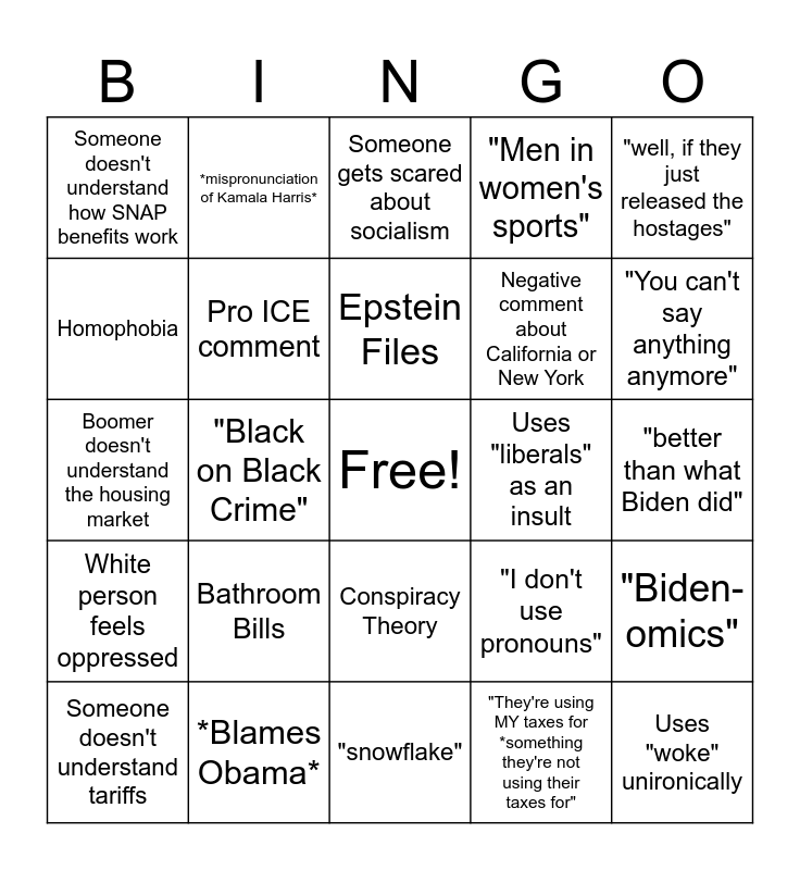 This bingo card has a free space and 37 words: Charlie Kirk, Fox News, Trump, Pro ICE comment, "Biden-omics", Bathroom Bills, Epstein Files, "I saw it on Facebook", "well, if they just released the hostages", Anti-vax, "Black on Black Crime", "Men in women's sports", Uses "woke" unironically, "better than what Biden did", Homophobia, White person feels oppressed, Racism, Someone gets scared about socialism, Conspiracy Theory, Uses "liberals" as an insult, Someone doesn't understand how SNAP benefits work, "You can't say anything anymore", Someone doesn't understand tariffs, "snowflake", "indoctrinating children", "They're using MY taxes for *something they're not using their taxes for", *mispronunciation of Kamala Harris*, National Guard shooting, Islamiphobia, *thinks communism and socialism are the same*, "no one wants to work anymore", *Blames Obama*, Boomer doesn't understand the housing market, News Max, "I don't use pronouns", Negative comment about California or New York and "why don't you come visit us more??".