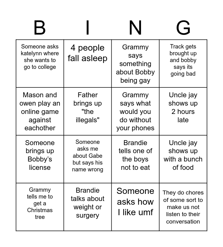 This bingo card has 16 words: Brandie talks about weight or surgery, Uncle jay shows up with a bunch of food, Grammy says something about Bobby being gay, Someone asks katelynn where she wants to go to college, Someone brings up Bobby’s license, 4 people fall asleep, Brandie tells one of the boys not to eat, Someone asks how I like umf, Mason and owen play an online game against eachother, Father brings up "the illegals", Grammy tells me to get a Christmas tree, Track gets brought up and bobby says its going bad, Someone asks me about Gabe but says his name wrong, Uncle jay shows up 2 hours late, Grammy says what would you do without your phones and They do chores of some sort to make us not listen to their conversation.