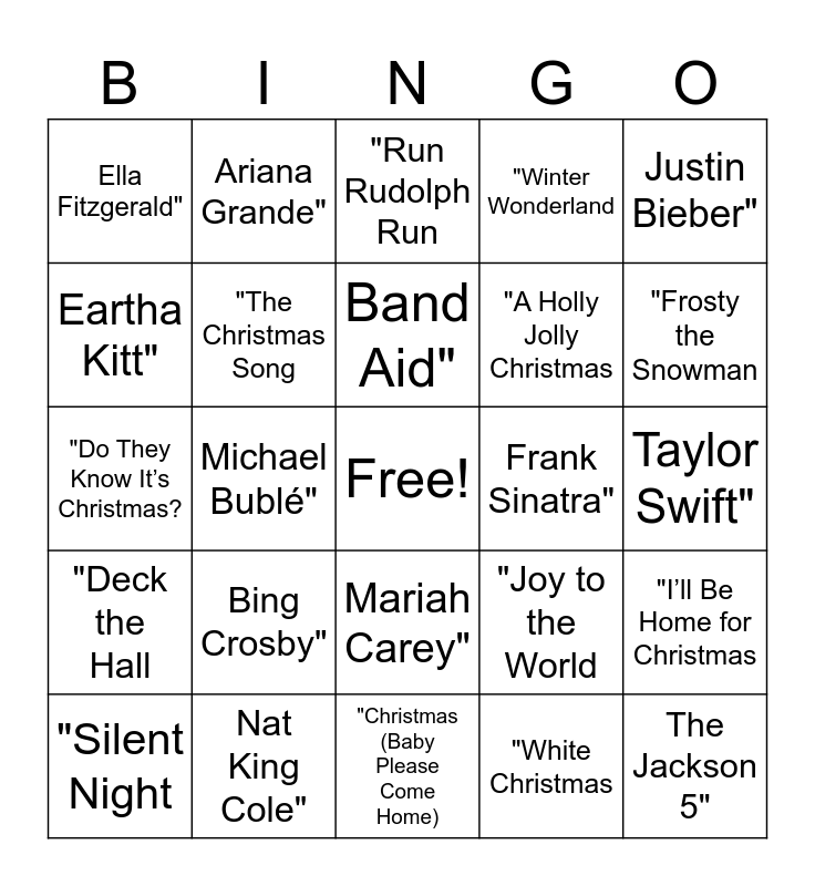 This bingo card has a free space and 80 words: "Christmas Lights, Coldplay", "Run Rudolph Run, Chuck Berry", "Sleigh Ride, The Ronettes", "Snowman, Sia", "Let It Snow! Let It Snow! Let It Snow!, Frank Sinatra", "O Holy Night, Nat King Cole", "Winter Wonderland, Ella Fitzgerald", "Santa Baby, Eartha Kitt", "Silver Bells, Bing Crosby", "Christmas Tree Farm, Taylor Swift", "Mistletoe, Justin Bieber", "Do They Know It’s Christmas?, Band Aid", "The Christmas Song, Nat King Cole", "Have Yourself a Merry Little Christmas, Frank Sinatra", "Underneath the Tree, Kelly Clarkson", "Frosty the Snowman, Gene Autry", "Christmas (Baby Please Come Home), Darlene Love", "Silent Night, Frank Sinatra", "Rudolph the Red-Nosed Reindeer, Gene Autry", "I Saw Mommy Kissing Santa Claus, The Jackson 5", "Thank God It’s Christmas, Queen", "Must Be Santa, Bob Dylan", "Santa Tell Me, Ariana Grande", "Feliz Navidad, José Feliciano", "Happy Xmas (War Is Over), John Lennon", "I’ll Be Home for Christmas, Michael Bublé", "Joy to the World, Nat King Cole", "Rockin’ Around the Christmas Tree, Brenda Lee", "It’s Beginning to Look a Lot Like Christmas, Perry Como", "All I Want for Christmas Is You, Mariah Carey", "A Holly Jolly Christmas, Burl Ives", "Carol of the Bells, Cathedral Choir", "Jingle Bells, Traditional", "Wonderful Christmastime, Paul McCartney", "Jingle Bell Rock, Bobby Helms", "Deck the Hall, Nat King Cole", "What Christmas Means to Me, Stevie Wonder", "Blue Christmas, Elvis Presley", "White Christmas, Bing Crosby", "Last Christmas and Wham!".