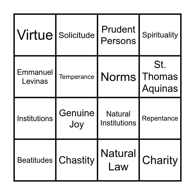 This bingo card has 25 words: Plato, Aristotle, St. Thomas Aquinas, Immanuel Kant, Emmanuel Levinas, Virtue, Temperance, Solicitude, Chastity, Friendships, Institutions, Natural Institutions, Moral Tradition, Laws, Norms, Rules, Natural Law, Prudent Persons, Genuine Joy, Repentance, Beatitudes, Worship, Charity, Spirituality and Vocation.