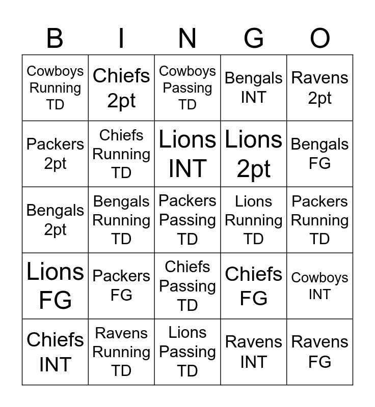 This bingo card has 30 words: Ravens Running TD, Ravens Passing TD, Bengals Running TD, Bangles Passing TD, Cowboys Running TD, Cowboys Passing TD, Chiefs Running TD, Chiefs Passing TD, Lions Running TD, Lions Passing TD, Packers Running TD, Packers Passing TD, Ravens INT, Ravens FG, Bengals FG, Cowboys FG, Chiefs FG, Lions FG, Packers FG, Ravens 2pt, Bengals 2pt, Cowboys 2pt, Chiefs 2pt, Lions 2pt, Packers 2pt, Bengals INT, Cowboys INT, Chiefs INT, Lions INT and Packers INT.