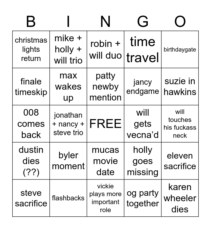 This bingo card has a free space and 24 words: byler moment, flashbacks, patty newby mention, steve sacrifice, birthdaygate, christmas lights return, finale timeskip, mike + holly + will trio, will gets vecna’d, mucas movie date, jancy endgame, 008 comes back, holly goes missing, eleven sacrifice, max wakes up, og party together, will touches his fuckass neck, robin + will duo, suzie in hawkins, jonathan + nancy + steve trio, karen wheeler dies, dustin dies (??), time travel and vickie plays more important role.