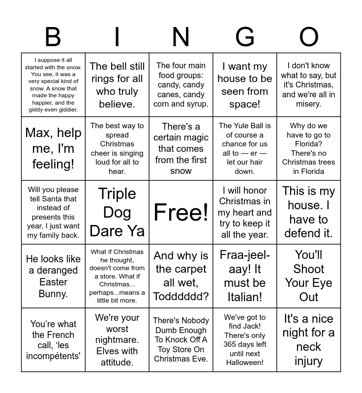 This bingo card has a free space and 79 words: I think we're gettin' scammed by a Kindergartener, His heart was 2 sizes too small, The four main food groups: candy, candy canes, candy corn and syrup., Nobody's walking out on this fun, old fashioned family Christmas., KEVIN?!!, You'll shoot your eye out kid!, God Bless us every one!, Merry Christmas you filthy animal., Isn't there anyone who knows what Christmas is all about?, Just remember the true spirit of Christmas lies in your heart., Faith is believing in things when common sense tells you not to., Seeing isn't believing. Believing is seeing., I want my house to be seen from space!, I suppose it all started with the snow. You see, it was a very special kind of snow. A snow that made the happy happier, and the giddy even giddier., Now I have a machine gun. Ho Ho Ho, Max, help me, I'm feeling!, Every time a bell rings an angel gets his wings., What if Christmas he thought, doesn't come from a store. What if Christmas... perhaps...means a little bit more., You're skipping Christmas! Isn't that against the law?, This is my house. I have to defend it., Yes! Yes I do! I like Christmas! I love Christmas!, I don't know what to say, but it's Christmas, and we're all in misery., Will you please tell Santa that instead of presents this year, I just want my family back., There's a certain magic that comes from the first snow, The best way to spread Christmas cheer is singing loud for all to hear., Are we on a coffee break? - We don't drink coffee. - Then I guess the break is over!, All the great ones leave their mark. We’re the wet bandits!, Just a fly in the ointment, Hans. The monkey in the wrench., Yippee-ki-yay., Seeing is believing, but sometimes the most real things in the world are the things we can’t see., Why do we have to go to Florida? There's no Christmas trees in Florida, Harry? You wearin' aftershave?, There's Nobody Dumb Enough To Knock Off A Toy Store On Christmas Eve., You can mess with a lot of things, but you can't mess with kids on Christmas., You’re what the French call, ‘les incompétents', I will honor Christmas in my heart and try to keep it all the year., You guys give up? Or are you thirsty for more?, Guys, I’m eating junk and watching rubbish! You better come out and stop me, Blast this Christmas music. It’s joyful and triumphant., It's a nice night for a neck injury, Merry Christmas, little fella. We know that you’re in there, and that you’re all alone., Oh, Christmas isn’t just a day, it’s a frame of mind., Every time a bell rings, an angel gets his wings., I never thought it was such a bad little tree. It’s not bad at all, really. Maybe it just needs a little love., Isn't it wonderful? I'm going to jail!, The bell still rings for all who truly believe., Put the cookie down! NOW!., God bless us, every one., That's twice this month you've slipped deadly nightshade into my tea and run off., Oh, Fudge, You'll Shoot Your Eye Out, Triple Dog Dare Ya, Fraa-jeel-aay! It must be Italian!, Buzz, your girlfriend. WOOF!, Keep the change, ya filthy animal., Santa!!!!! Santa, here?! I know him! I know him!!, Look what you did, you little jerk!, Mom? This box is meowing., Son of a nutcracker!, And why is the carpet all wet, Todddddd?, The Yule Ball is of course a chance for us all to — er — let our hair down., Why, To the North Pole, of course! This Is the Polar Express, 4:00, wallow in self-pity, Where are you gonna get more sweaters after the circus pulls out of town?, Down the chimney? You want me to take the toys down the chimney into a strange house, IN MY UNDERWEAR?, You smell like beef and cheese, What if Christmas, he thought, doesn't come from a store, Can I refill your eggnog for you? Get you something to eat? Drive you out to the middle of nowhere and leave you for dead?, When I wake up, I'm getting a CAT scan!, He looks like a deranged Easter Bunny., We're your worst nightmare. Elves with attitude., "What'd it feel like, Dad?" "It felt like America's Most Wanted., Well, isn't that a pretty picture, Santa rolling down the block in a PANZER!, Save the neck for me, Clark!, I don’t want to spend the holidays dead!, We've got to find Jack! There's only 365 days left until next Halloween!, And on a dark cold night, under full moonlight, he flies into the fog like a vulture in the sky!, All I want is what I have coming to me. All I want is my fair share. and Please note the size and color of each item, and send as many as possible. If it seems too complicated, make it easy on yourself: just send money. How about tens and twenties?.