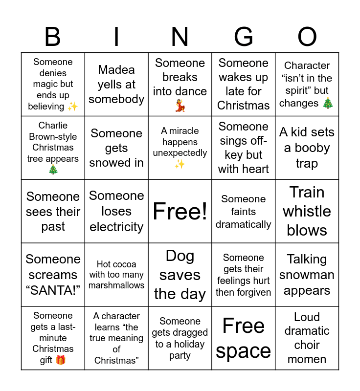 This bingo card has a free space and 25 words: Hot cocoa with too many marshmallows, Someone gets dragged to a holiday party, A miracle happens unexpectedly ✨, Someone gets a last-minute Christmas gift 🎁, Character “isn’t in the spirit” but changes 🎄, Someone denies magic but ends up believing ✨, Charlie Brown-style Christmas tree appears 🎄, Madea yells at somebody, Someone faints dramatically, Dog saves the day, Someone sings off-key but with heart, Someone sees their past, Someone gets their feelings hurt then forgiven, Talking snowman appears, Someone gets snowed in, Grinch-y attitude turns soft, Train whistle blows, Someone breaks into dance 💃, A kid sets a booby trap, Someone loses electricity, Loud dramatic choir momen, A character learns “the true meaning of Christmas”, Someone screams “SANTA!”, Someone wakes up late for Christmas and Free space.