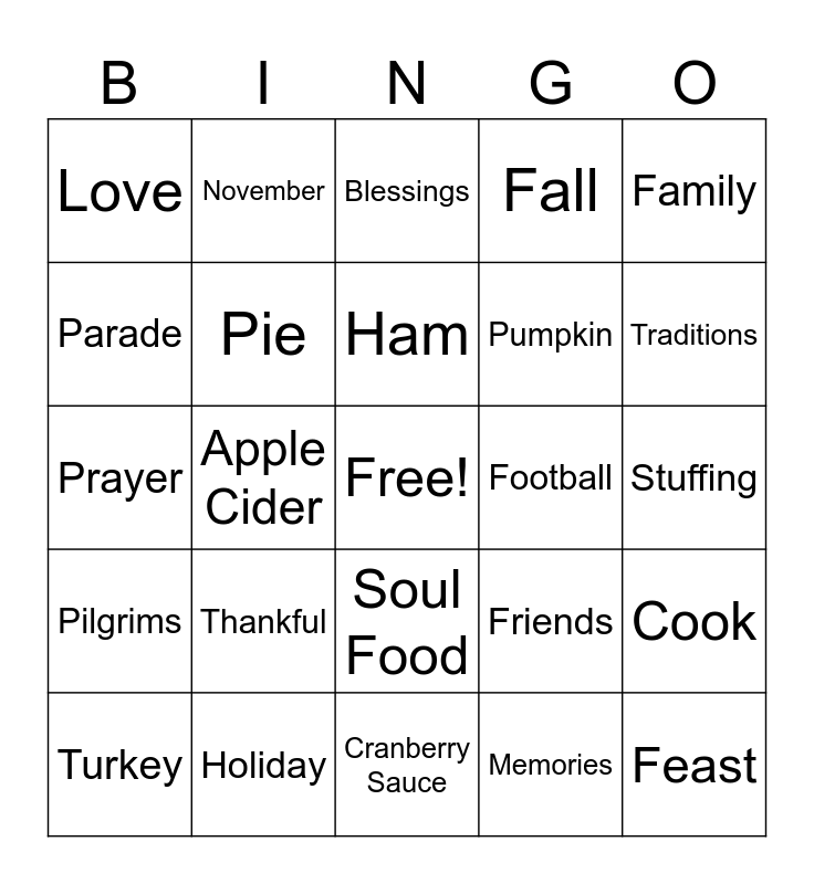 This bingo card has a free space and 24 words: Thankful, Holiday, Ham, Turkey, Family, Love, Parade, November, Football, Soul Food, Pumpkin, Prayer, Friends, Cook, Pie, Memories, Stuffing, Blessings, Traditions, Apple Cider, Feast, Pilgrims, Fall and Cranberry Sauce.