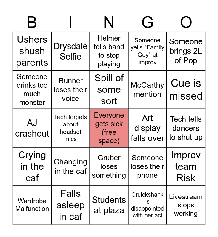 This bingo card has a free space and 24 words: Changing in the caf, Falls asleep in caf, Spill of some sort, Wardrobe Malfunction, Someone brings 2L of Pop, Ushers shush parents, Someone drinks too much monster, Drysdale Selfie, Art display falls over, Gruber loses something, McCarthy mention, AJ crashout, Someone loses their phone, Improv team Risk, Runner loses their voice, Cruickshank is disappointed with her act, Tech tells dancers to shut up, Helmer tells band to stop playing, Cue is missed, Tech forgets about headset mics, Livestream stops working, Crying in the caf, Someone yells "Family Guy" at improv and Students at plaza.