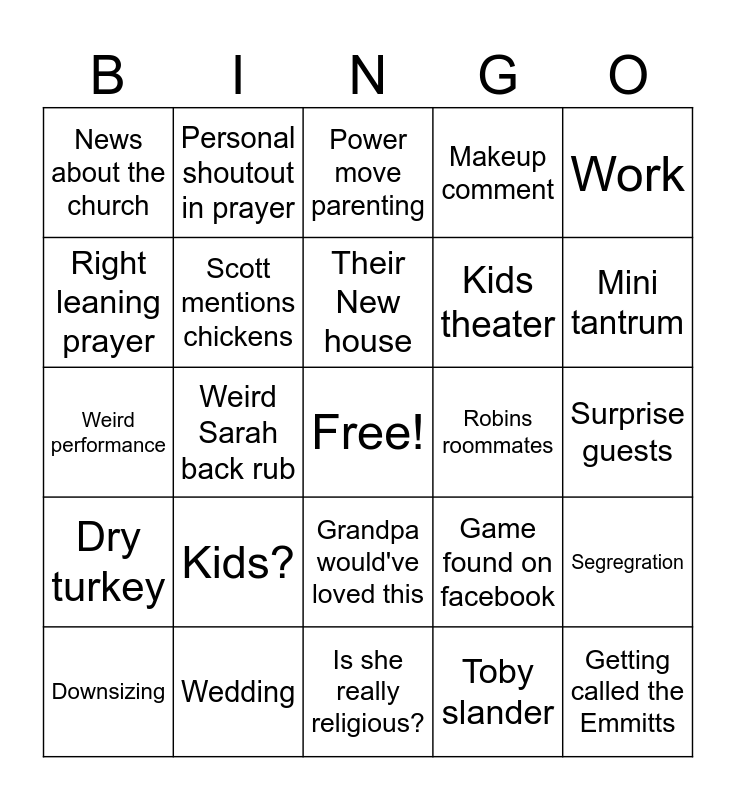 This bingo card has a free space and 24 words: Kids?, Wedding, Their New house, Downsizing, Work, News about the church, Right leaning prayer, Personal shoutout in prayer, Robins roommates, Grandpa would've loved this, Kids theater, Weird performance, Game found on facebook, Segregration, Scott mentions chickens, Toby slander, Surprise guests, Power move parenting, Mini tantrum, Weird Sarah back rub, Getting called the Emmitts, Dry turkey, Makeup comment and Is she really religious?.