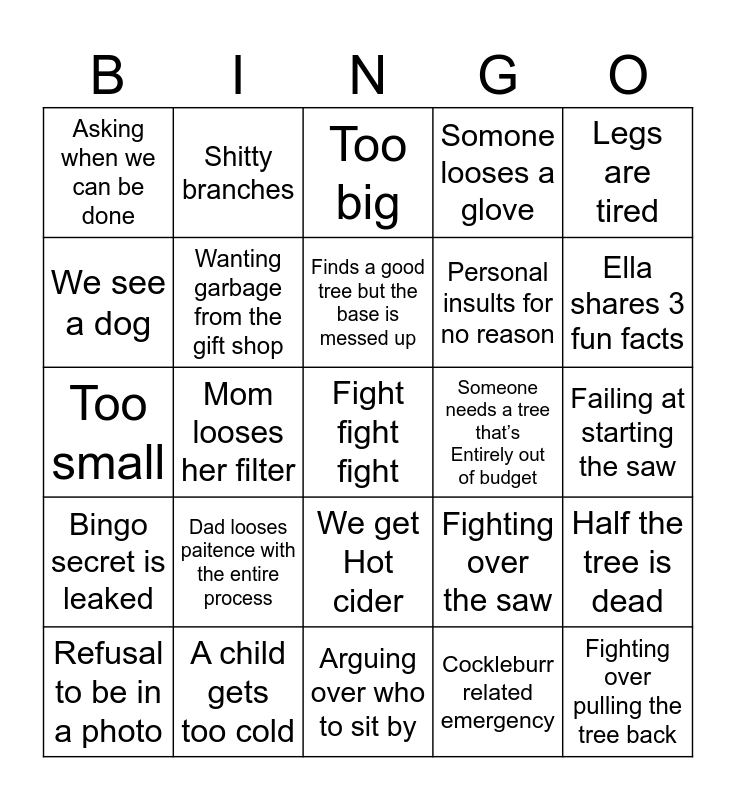 This bingo card has a free space and 24 words: Dad looses paitence with the entire process, A child gets too cold, Finds a good tree but the base is messed up, Refusal to be in a photo, Legs are tired, Asking when we can be done, We see a dog, Shitty branches, Someone needs a tree that’s Entirely out of budget, We get Hot cider, Personal insults for no reason, Too small, Fighting over the saw, Half the tree is dead, Wanting garbage from the gift shop, Cockleburr related emergency, Failing at starting the saw, Too big, Ella shares 3 fun facts, Mom looses her filter, Fighting over pulling the tree back, Bingo secret is leaked, Somone looses a glove and Arguing over who to sit by.
