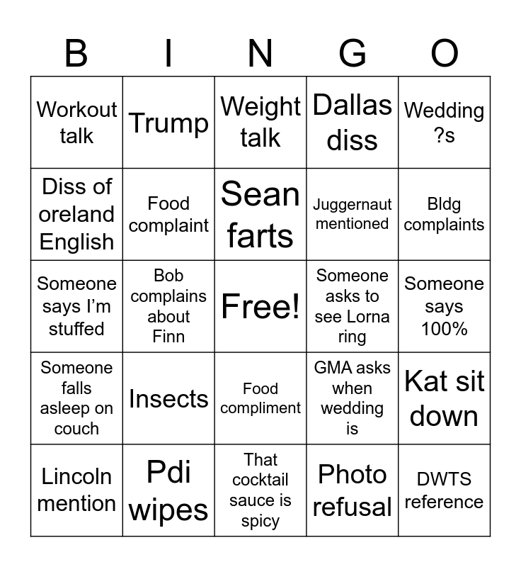 This bingo card has a free space and 24 words: Insects, Pdi wipes, Sean farts, Lincoln mention, Wedding ?s, Workout talk, Diss of oreland English, Trump, Someone asks to see Lorna ring, Food compliment, Juggernaut mentioned, Someone says I’m stuffed, GMA asks when wedding is, Kat sit down, Food complaint, Photo refusal, Someone says 100%, Weight talk, Bldg complaints, Bob complains about Finn, DWTS reference, Someone falls asleep on couch, Dallas diss and That cocktail sauce is spicy.