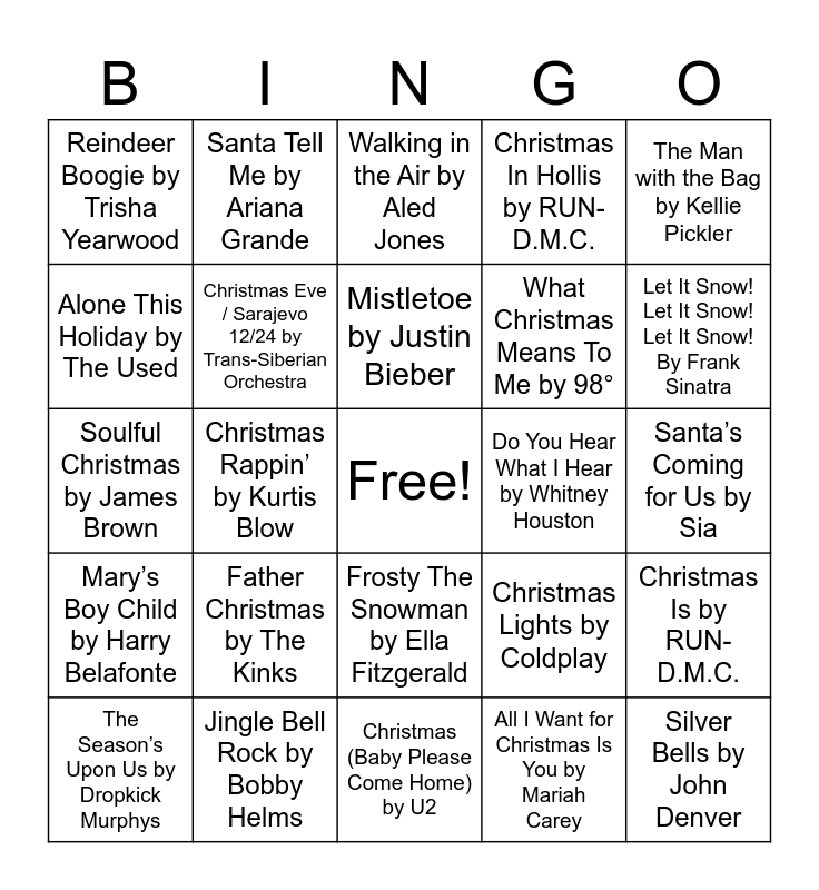 This bingo card has a free space and 96 words: Every year, Every Christmas by Luther Vandross, Mistress for Christmas by AC/DC, Sleigh Ride by Ella Fitzgerald, Do You Hear What I Hear by Whitney Houston, Oh Come All Ye Faithful by Twisted Sister, Winter Wonderland / Here comes Santa Claus by Snoop Dogg & Anna Kendrick, You’re a Mean One Mr Grinch by Tyler, The Creator, Santa Claus Is Coming To Town by The Jackson 5, DJ Play a Christmas Song by Cher, The Christmas Waltz by She & Him, I Saw Mommy Kissing Santa Claus by The Jackson 5, What You Want For Christmas by Quad City DI’s, My Only Wish (This Year) by Britney Spears, Let It Snow! Let It Snow! Let It Snow! By Frank Sinatra, Holiday Road – Natonal Lampoon’s Vacation by Lindsey Buckingham, Alone This Holiday by The Used, Mistletoe by Justin Bieber, Christmas Time by The Backstreet Boys, This Christmas by Chris Brown, Mele Kalikimaka by Jimmy Buffett, Blue Christmas – Elvis Presley, One More Sleep – Leona Lewis, Shake Up Christmas – Train, The Little Drummer Boy by Johnny Cash, Frosty The Snowman by Ella Fitzgerald, Christmas (Baby Please Come Home) by U2, Yellin’ At The Xmas Tree by Billy Idol, Reindeer Boogie by Trisha Yearwood, Merry Christmas, Darling by Carpenters, Joy To The World by Nat King Cole, The First Noel by Frank Sinatra, Christmas Lights by Coldplay, Angels We Have Heard on High by The Piano Guys, Winter Wonderland by Tony Bennett, The Man with the Bag by Kellie Pickler, Don’t Shoot Me Santa by The Killers, Christmas Is by RUN-D.M.C., I’ll Be Home by Meghan Trainor, Oi To The World by No Doubt, Christmas Rappin’ by Kurtis Blow, Mary’s Boy Child / Oh My Lord by Boney M., The Season’s Upon Us by Dropkick Murphys, Silver Bells by John Denver, Jingle Bell Rock by Bobby Helms, Mary’s Boy Child by Harry Belafonte, Walking in the Air by Aled Jones, Dear Santa by Onerepublic, Last Christmas by Wham!, Wrapped in Red by Kelly Clarkson, Run Rudolph Run by William Shatner, Yule Shoot Your Eye Out by Fall Out Boy, Thank God It’s Christmas by Queen, That’s Christmas to Me by Pentatonix, 8 Days of Christmas by Destiny’s Child, Ho Ho Ho And A Bottle Of Rhum by Jimmy Buffett, Fairytale of New York by The Pogues, Rudolph The Red Nosed Reindeer by DMX, Driving Home for Christmas by Chris Rea, (It Must’ve Been OI’) Santa Claus by Harry Connick, Jr., Santa Claus Is Comin’ to Town by Bruce Springsteen, Grandma Got Run over by a Reindeer by Elmo & Patsy, Little Saint Nick by The Beach Boys, Grandma Got Run Over By A Reindeer by Reel Big Fish, Do They Know It’s Christmas? By Band Aid, Happy Xmas (War Is Over) by John Lennon, Like It’s Christmas by Jonas Brothers, Step Into Christmas by Elton John, Deck the Halls by Mannheim Steamroller, Must Be Santa by Bob Dylan, All I Want for Christmas Is You by Mariah Carey, Green Christmas by Barenaked Ladies, Holly Jolly Christmas by Michael Bubblé, Feliz Navidad by José Feliciano, Christmas Every Day by Simple Plan, What Are You Doing New Year’s Eve? By Harry Connick Jr, Wizards in Winter by Trans-Siberian Orchestra, It’s Beginning to Look a Lot like Christmas by Michael Bubblé, Christmas Eve / Sarajevo 12/24 by Trans-Siberian Orchestra, Christmas Time (Don’t Let the Bells End) by The Darkness, What Christmas Means To Me by 98°, Christmas In Hollis by RUN-D.M.C., Christmas Dirtbag by Wheatus, Winter Wonderland by Harry Connick Jr, The Chanukah Song by Adam Sandler, Deck The Halls by Nat King Cole, Soulful Christmas by James Brown, Father Christmas by The Kinks, Main Title from Home Alone by John Williams, Groovy Xmas by The Linda Lindas, Santa’s Coming for Us by Sia, I Saw Mommy Kissing Santa Claus by John Mellencamp, Kidnap The Sandy Claws by Korn, Christmas Song by Dave Matthews Band, Bring Me Love by John Legend, Santa Tell Me by Ariana Grande and Time for Change Robbie Williams.