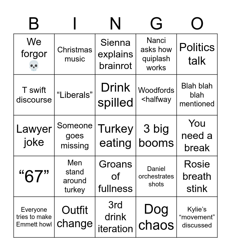 This bingo card has a free space and 24 words: Men stand around turkey, Outfit change, Drink spilled, Everyone tries to make Emmett howl, Politics talk, We forgor 💀, T swift discourse, Christmas music, 3 big booms, Groans of fullness, Woodfords <halfway, Lawyer joke, Daniel orchestrates shots, Rosie breath stink, “Liberals”, Dog chaos, You need a break, Sienna explains brainrot, Blah blah blah mentioned, Someone goes missing, Kylie’s “movement” discussed, “67”, Nanci asks how quiplash works and 3rd drink iteration.