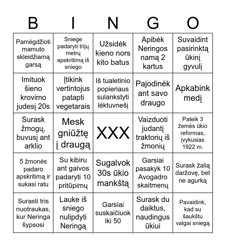 This bingo card has a free space and 24 words: Su kibiru ant galvos padaryti 10 pritūpimų, Lauke iš sniego nulipdyti Neringą, Iš tualetinio popieriaus sulankstyti lėktuvnešį, Surasti tris nuotraukas, kur Neringa šypsosi, Suvaidint pasirinktą ūkinį gyvulį, Pamėgdžioti mamuto skleidžiamą garsą, Imituok šieno krovimo judesį 20s, Sniege padaryti trijų metrų apskritimą iš sniego, Vaizduoti judantį traktorių iš žmonių, Sugalvok 30s ūkio mankštą, Pajodinėk ant savo draugo, Surask žmogų, buvusį ant arklio, Garsiai pasakyk 10 Avogadro skaitmenų, Surask žalią daržovę, bet ne agurką, Įtikink vertintojus patapti vegetarais, Surask du daiktus, naudingus ūkiui, Pateik 3 žemės ūkio reformas, įvykusias 1922 m., Užsidėk kieno nors kito batus, Apkabink medį, Mesk gniūžtę į draugą, Pavaidink, kad su šaukštu valgai sniegą, 5 žmonės padaro apskritimą ir sukasi ratu, Apibėk Neringos namą 2 kartus and Garsiai suskaičiuok iki 50.