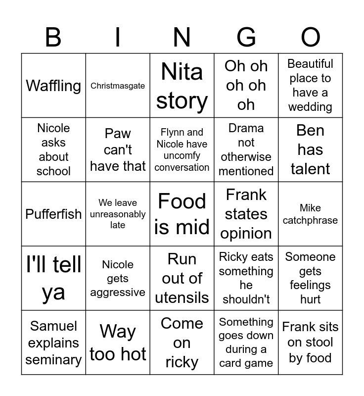 This bingo card has a free space and 24 words: Nicole gets aggressive, Way too hot, Flynn and Nicole have uncomfy conversation, Samuel explains seminary, Beautiful place to have a wedding, Waffling, Nicole asks about school, Christmasgate, Frank states opinion, Run out of utensils, Drama not otherwise mentioned, Pufferfish, Ricky eats something he shouldn't, Someone gets feelings hurt, Paw can't have that, Something goes down during a card game, Mike catchphrase, Nita story, Ben has talent, We leave unreasonably late, Frank sits on stool by food, I'll tell ya, Oh oh oh oh oh and Come on ricky.