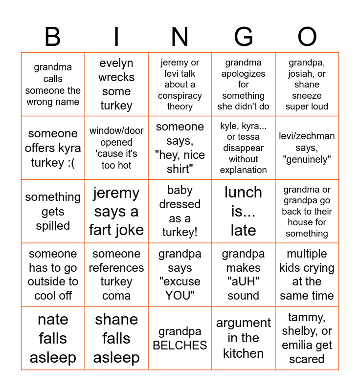 This bingo card has a free space and 34 words: grandpa antagonizes a child, grandma loses her phone, GRANDMA SAYS "OH BEANS", something gets burnt, grandma or grandpa go back to their house for something, someone offers kyra turkey :(, window/door opened 'cause it's too hot, grandpa BELCHES, kyle, kyra... or tessa disappear without explanation, tammy, shelby, or emilia get scared, something gets spilled, evelyn wrecks some turkey, argument in the kitchen, someone wants to play village idiot, someone has to go outside to cool off, jeremy says a fart joke, grandpa says "excuse YOU", lunch is... late, multiple kids crying at the same time, nate falls asleep, shane falls asleep, grandpa falls asleep, grandma apologizes for something she didn't do, levi/zechman says, "genuinely", someone references tryptophan, someone references turkey coma, jeremy or levi talk about a conspiracy theory, someone cries during pictures, grandpa, josiah, or shane sneeze super loud, grandma calls someone the wrong name, someone asks tammy or nate where something is, someone says, "hey, nice shirt", grandpa makes "aUH" sound and someone spills something on their reunion shirt.