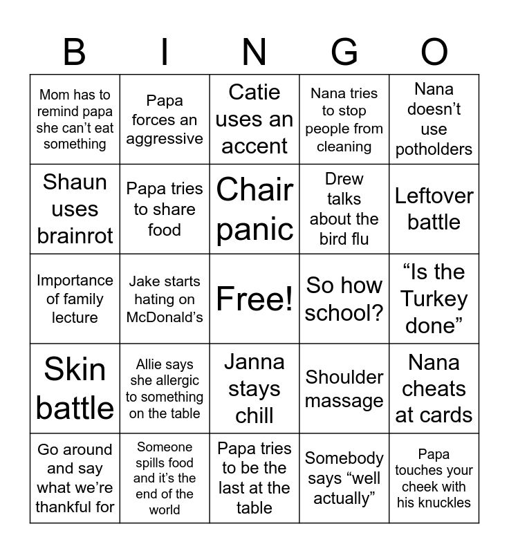 This bingo card has a free space and 24 words: Allie says she allergic to something on the table, Someone spills food and it’s the end of the world, Chair panic, Go around and say what we’re thankful for, Nana doesn’t use potholders, Mom has to remind papa she can’t eat something, Shaun uses brainrot, Papa forces an aggressive, So how school?, Janna stays chill, Drew talks about the bird flu, Importance of family lecture, Shoulder massage, Nana cheats at cards, Papa tries to share food, Somebody says “well actually”, “Is the Turkey done”, Catie uses an accent, Leftover battle, Jake starts hating on McDonald’s, Papa touches your cheek with his knuckles, Skin battle, Nana tries to stop people from cleaning and Papa tries to be the last at the table.